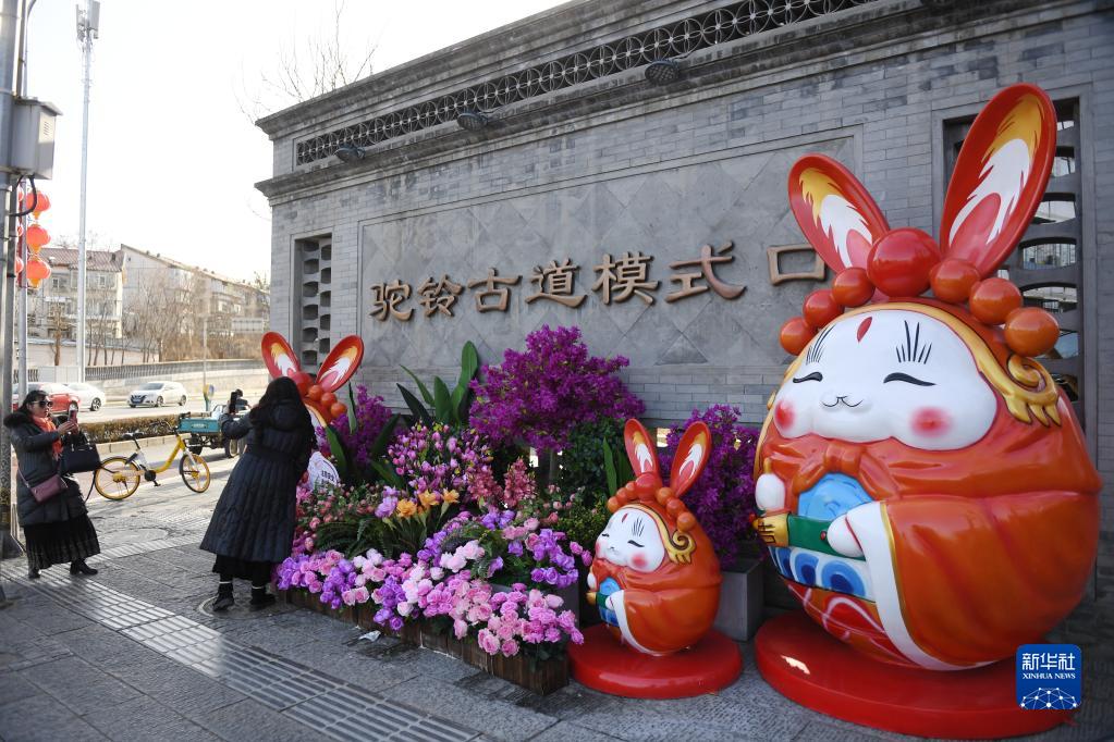 1月17日,游客在擺放著(zhù)兔爺的石景山區模式口歷史文化街區拍照。