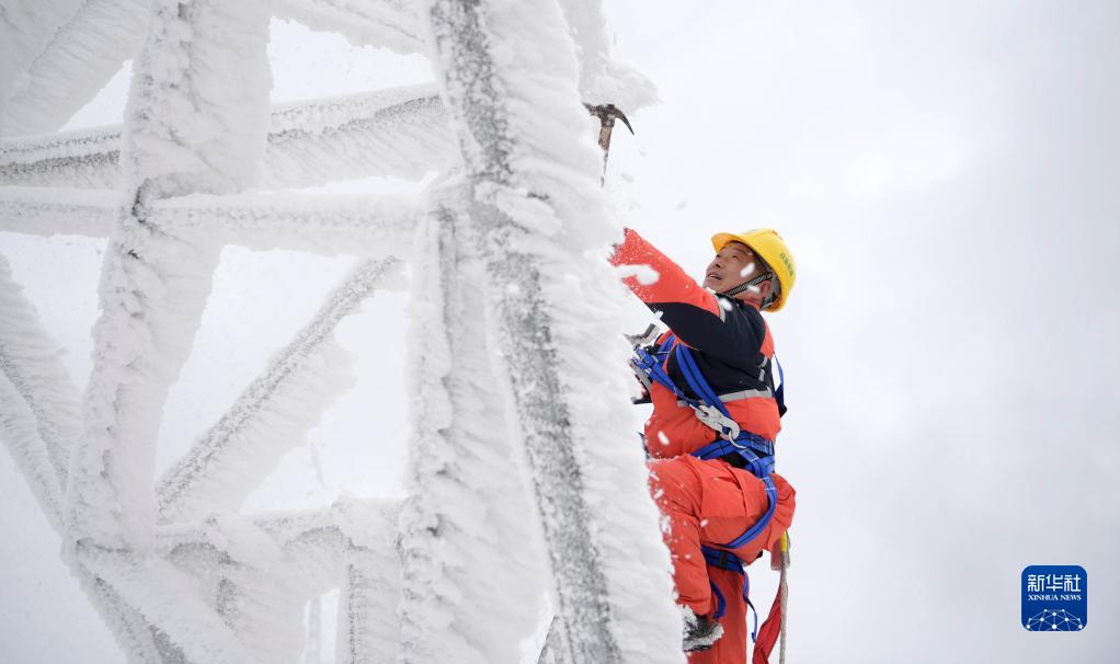 1月17日,在湖北省鶴峰縣山區,應急搶險人員在鐵塔上除冰雪。