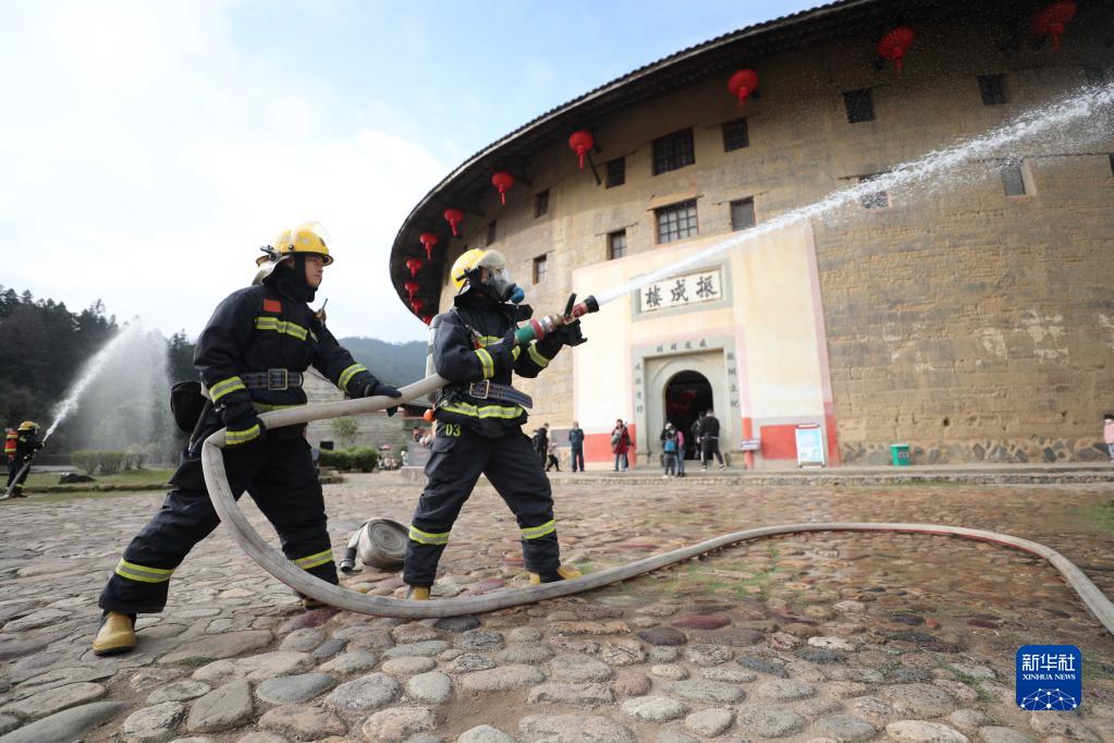 1月17日,消防隊員在福建省龍巖市永定土樓進(jìn)行滅火救援實(shí)戰演練。