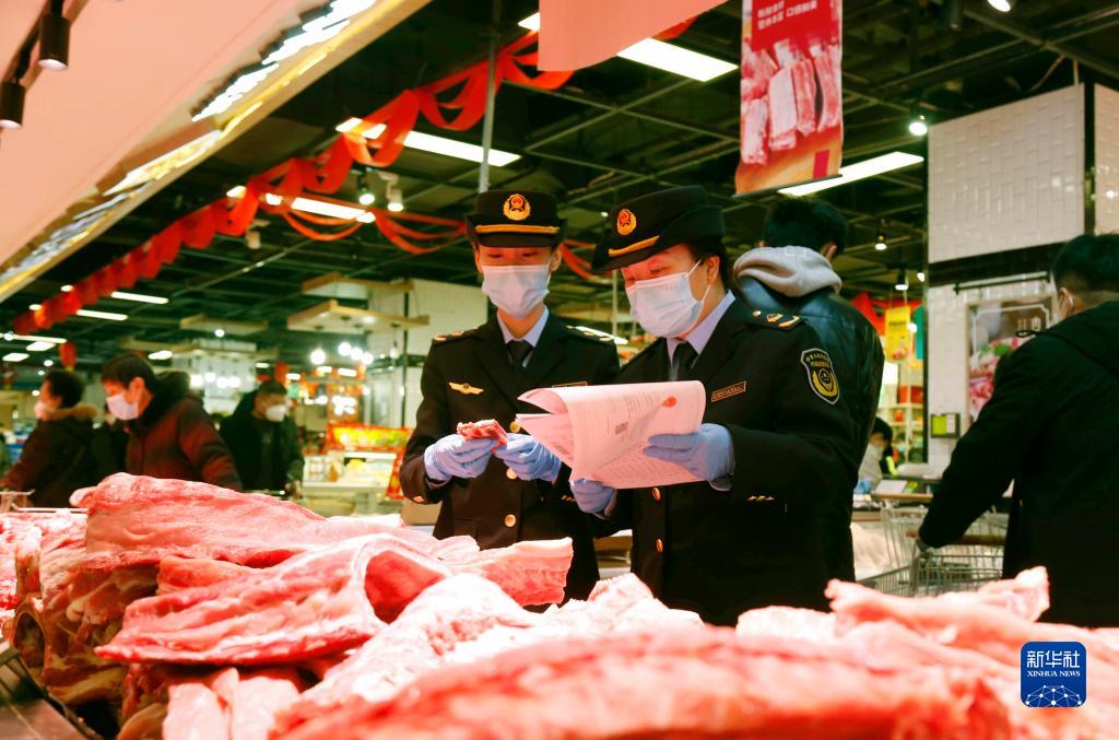 1月17日,邢臺市襄都區市場(chǎng)監督管理局工作人員檢查一家超市的肉類(lèi)。