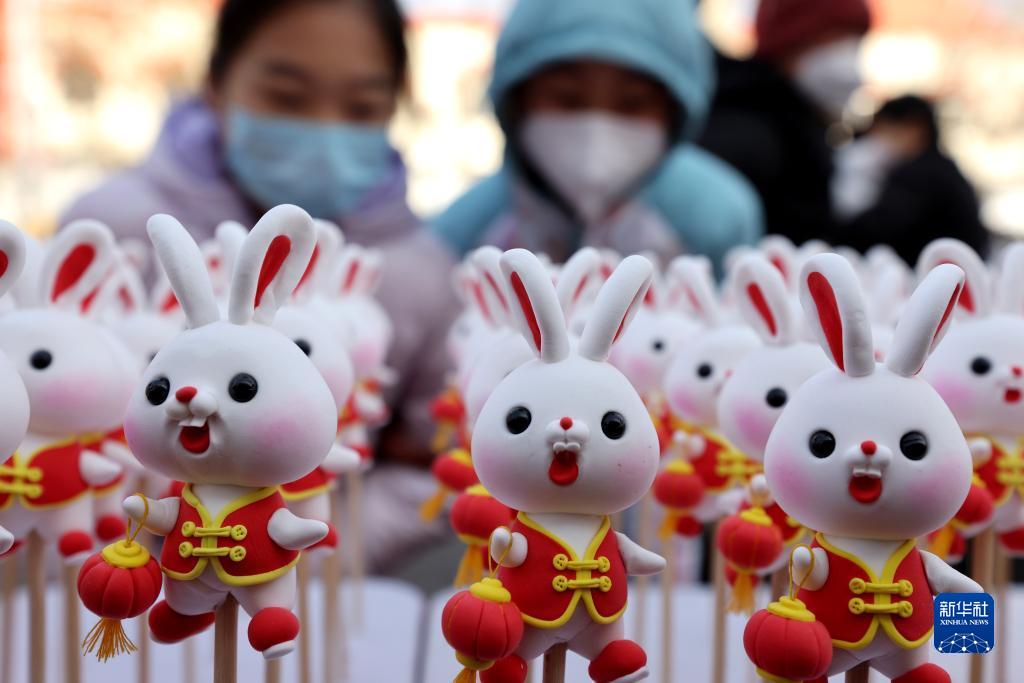 1月18日,在山東省棗莊市文化館,小朋友在挑選面塑“萌兔”。