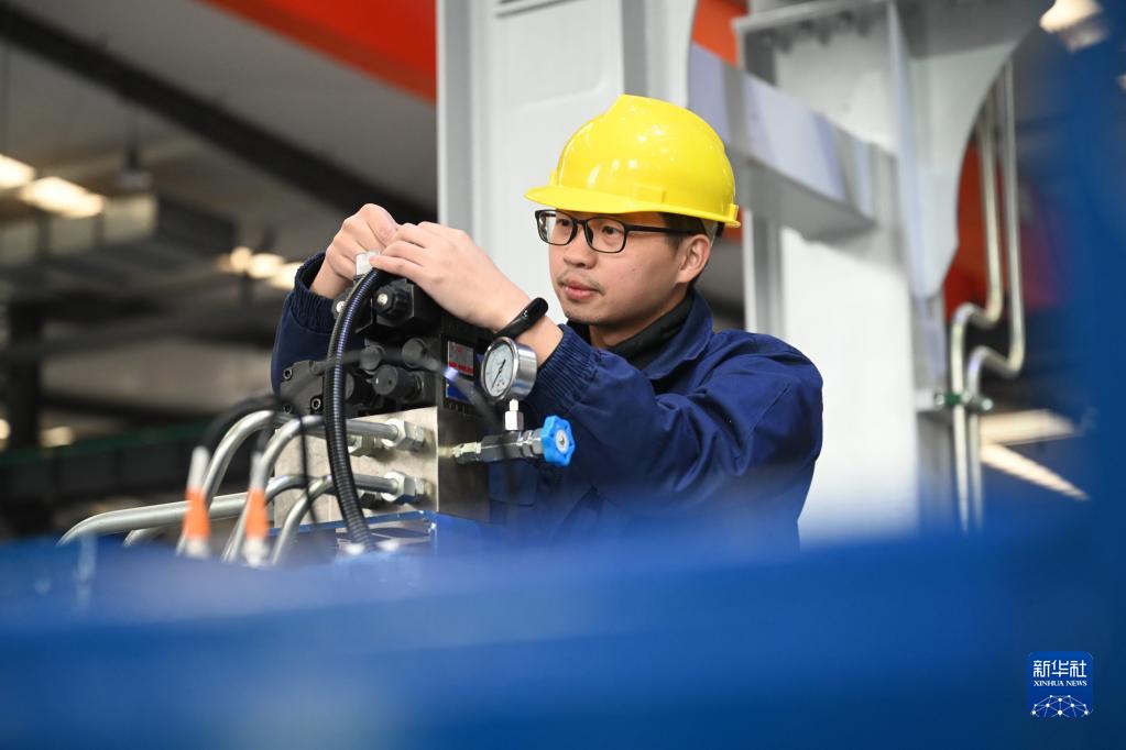 福建泉工股份有限公司工作人員在安裝銷(xiāo)往海外的全自動(dòng)砌塊成型機(2022年12月14日攝)。