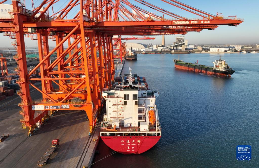 1月15日,一艘輪船靠泊在唐山港京唐港區集裝箱碼頭(無(wú)人機照片)。