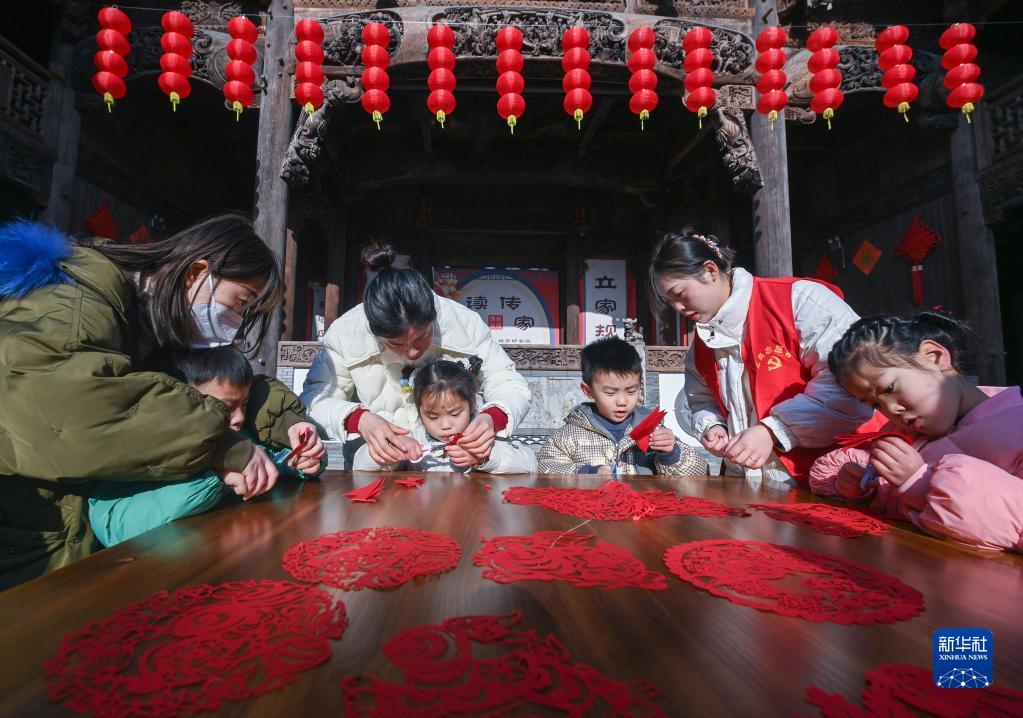 1月18日,在長(cháng)興縣李家巷石泉村的古建筑“百桌廳”內,孩子們在教師志愿者的帶領(lǐng)下學(xué)習剪紙。