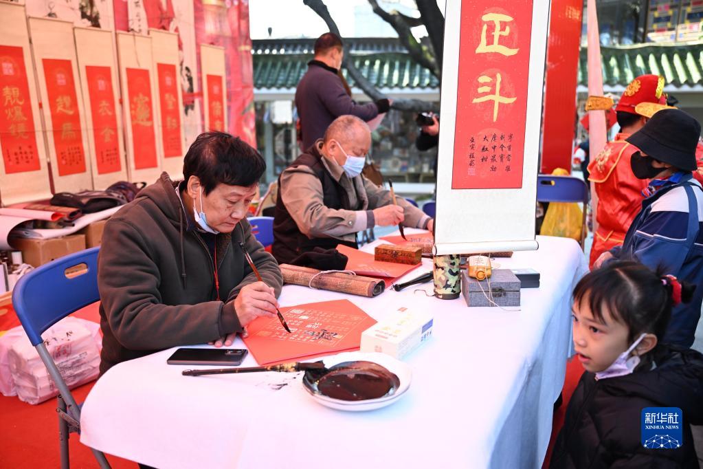1月18日,書(shū)法家在水上花市啟動(dòng)儀式上為市民寫(xiě)春聯(lián)。