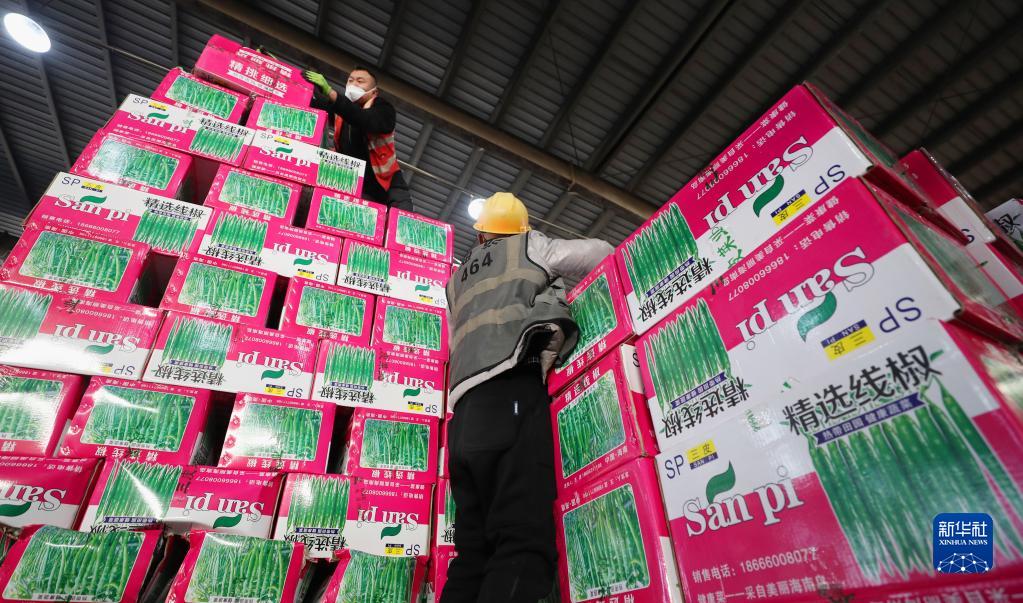 1月17日,在上海江橋蔬菜批發(fā)市場(chǎng)內,工人搬運來(lái)自海南的辣椒。