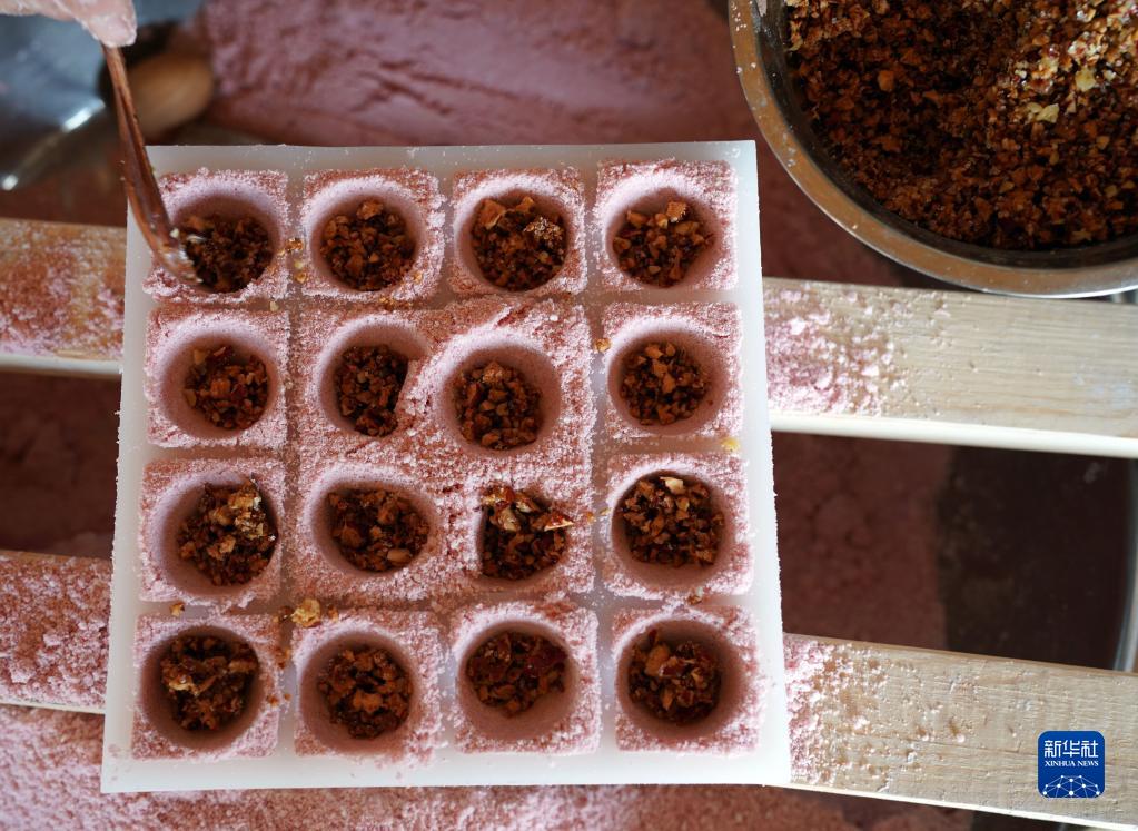 1月17日,在青浦區練塘鎮的米樂(lè )農莊,居民制作紅棗核桃餡的奘糕。