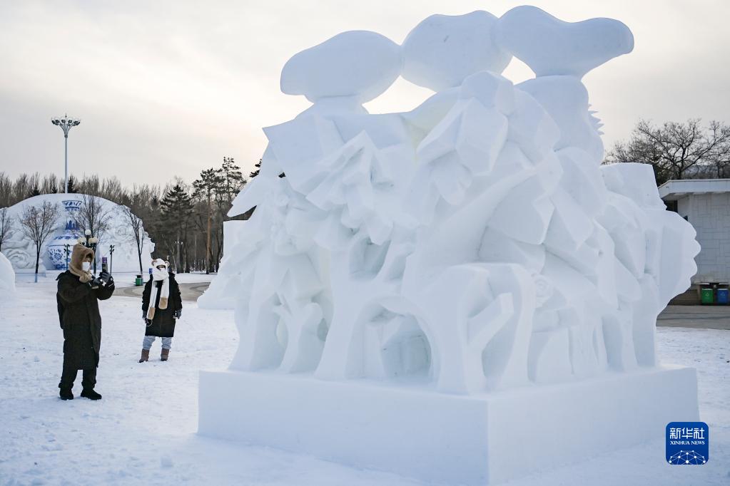 1月18日,在哈爾濱太陽(yáng)島雪博會(huì )園區,游客觀(guān)賞參賽雪雕作品。