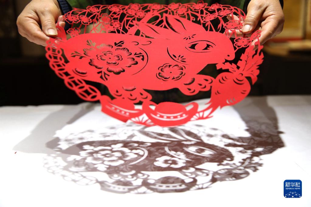 1月18日,在承德市雙橋區俊鳳剪紙創(chuàng )作室,剪紙藝人石俊鳳展示賀歲迎春生肖兔主題剪紙作品。
