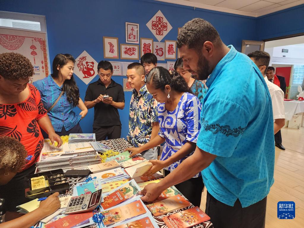 1月18日,在斐濟首都蘇瓦的斐濟中國文化中心,嘉賓們在中國農歷兔年生肖郵票及首日封發(fā)行儀式上選購。