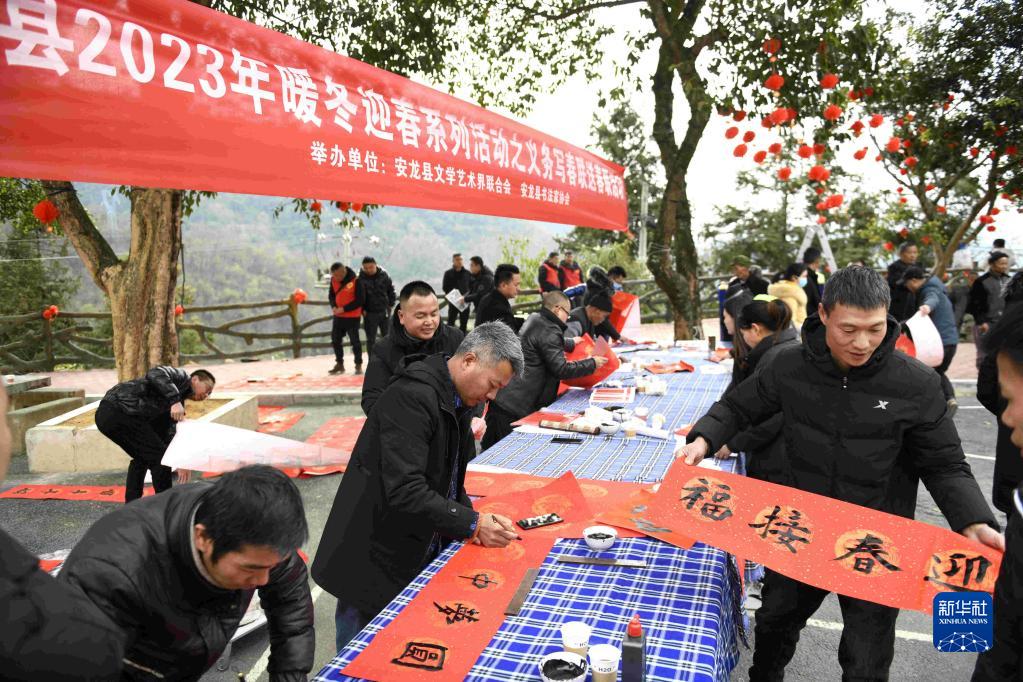 春節臨近,各地舉行寫(xiě)春聯(lián)送祝?;顒?dòng),書(shū)法志愿者為群眾書(shū)寫(xiě)并贈送新春對聯(lián)和福字,送上新春祝福。