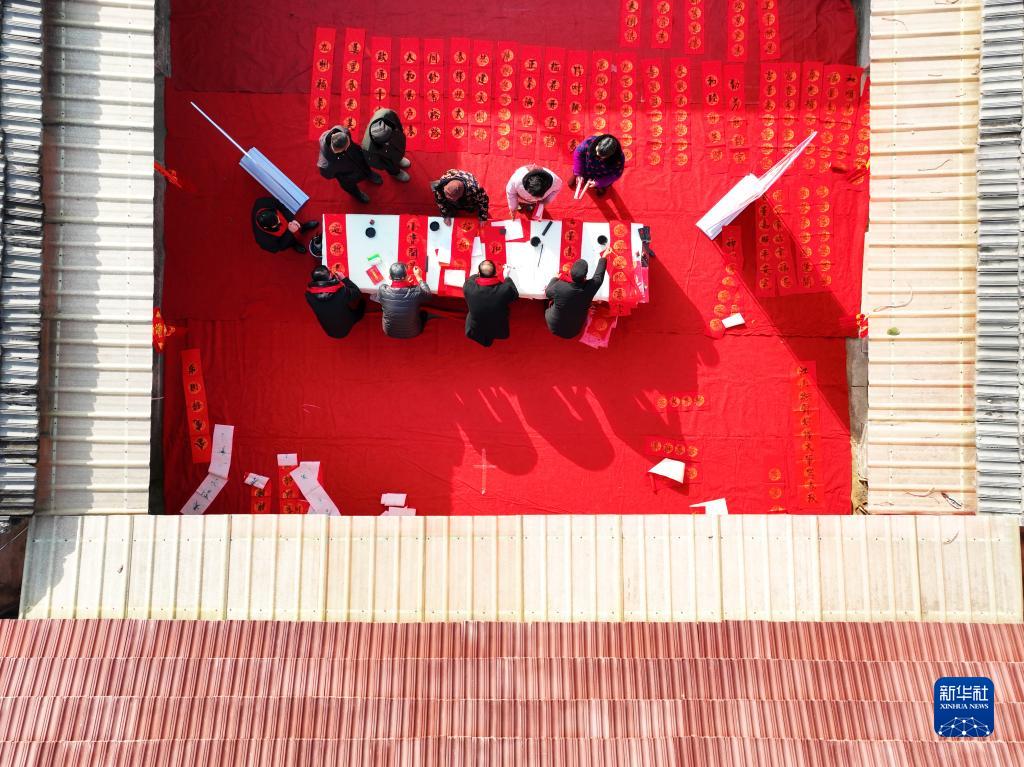 1月18日,在江蘇省泗洪縣界集鎮武崗村,書(shū)法志愿者為村民寫(xiě)春聯(lián)(無(wú)人機照片)。