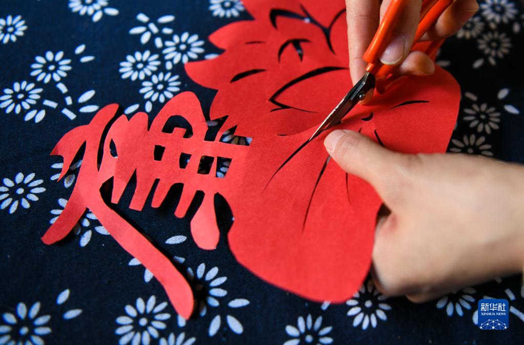 1月18日,在常寧市廟前鎮中田古村,常寧市剪紙非遺傳承人展示剪紙技藝。
