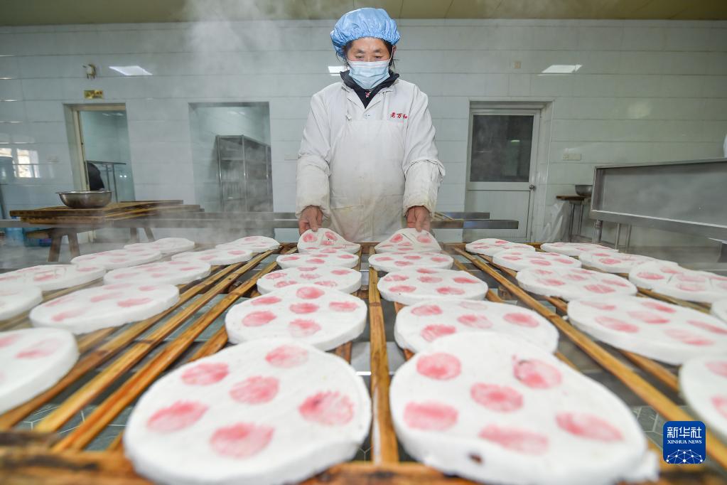 1月17日,在江蘇省南通市如皋市老萬(wàn)和潮糕店,工作人員在整理剛蒸好的林梓潮糕。林梓潮糕是當地傳統點(diǎn)心,由糯米、粳米加工成米粉,拌上白糖、桂花等制成糕坯,再經(jīng)多道工序蒸制而成。