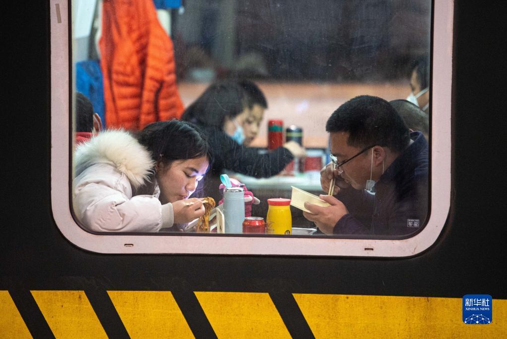 1月18日,旅客在K209次列車(chē)上吃晚餐。
