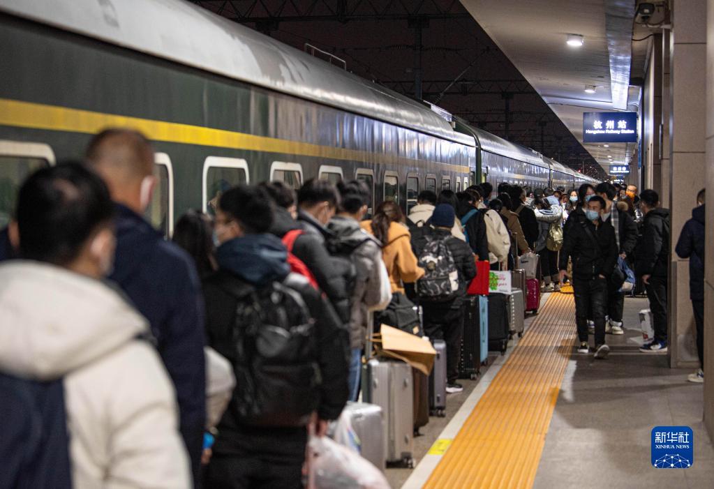 1月18日傍晚,等待登上K209次列車(chē)的旅客在杭州站站臺上排起長(cháng)隊。