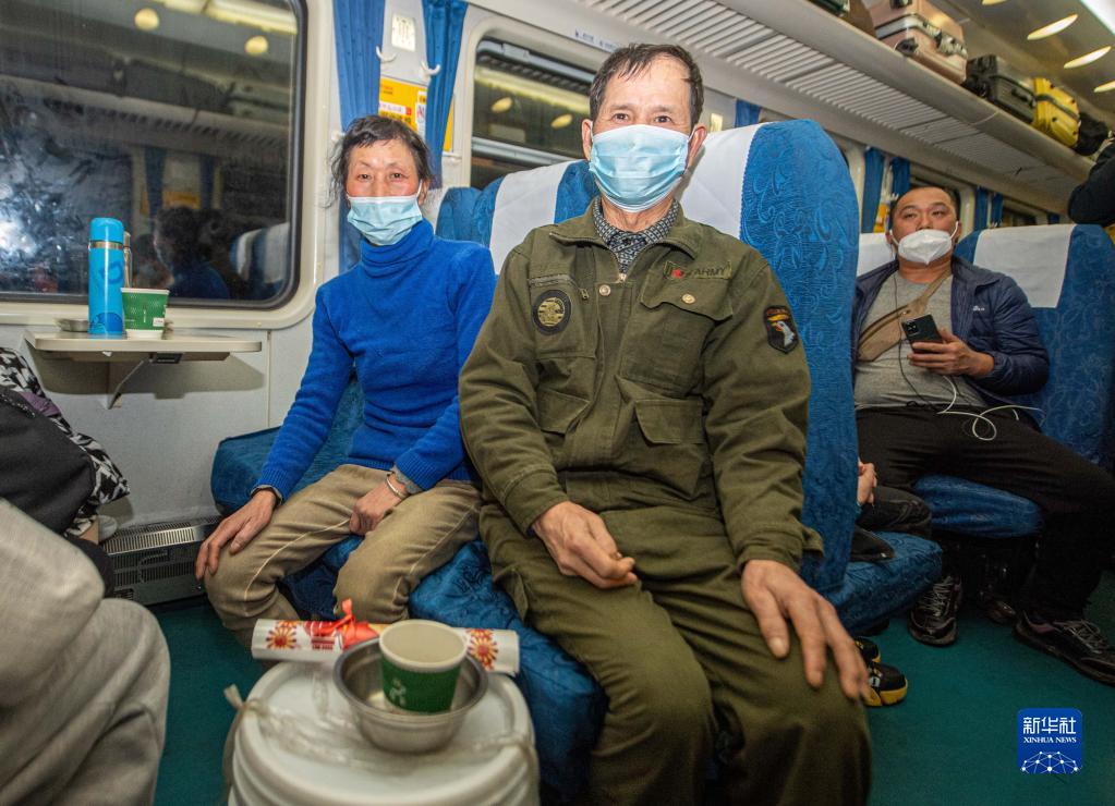 1月18日,回江西永新縣老家過(guò)年的周小蘭(左)、王小明(左二)夫婦在車(chē)廂內合影。腳下的桶里裝滿(mǎn)了帶回家的年貨。