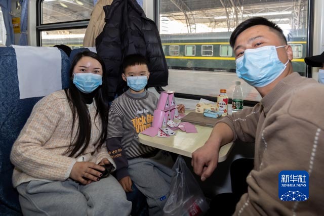 1月18日,在1462次列車(chē)上,沈連杰(右)一家三口在回家的路上玩紙牌。時(shí)隔3年,沈連杰一家三口返回安徽蚌埠老家過(guò)春節。