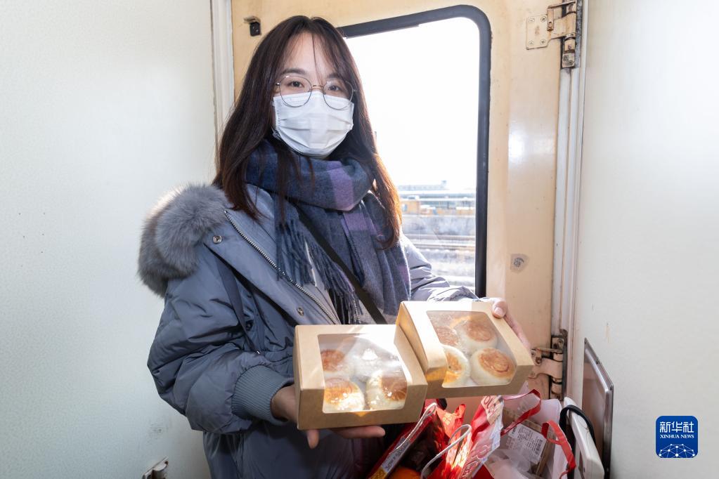 1月18日,一名“90”后女生在1462次列車(chē)上展示為家人購買(mǎi)的上海特產(chǎn)“鮮肉月餅”。列車(chē)即將到站,女生早早來(lái)到車(chē)門(mén)口等待。