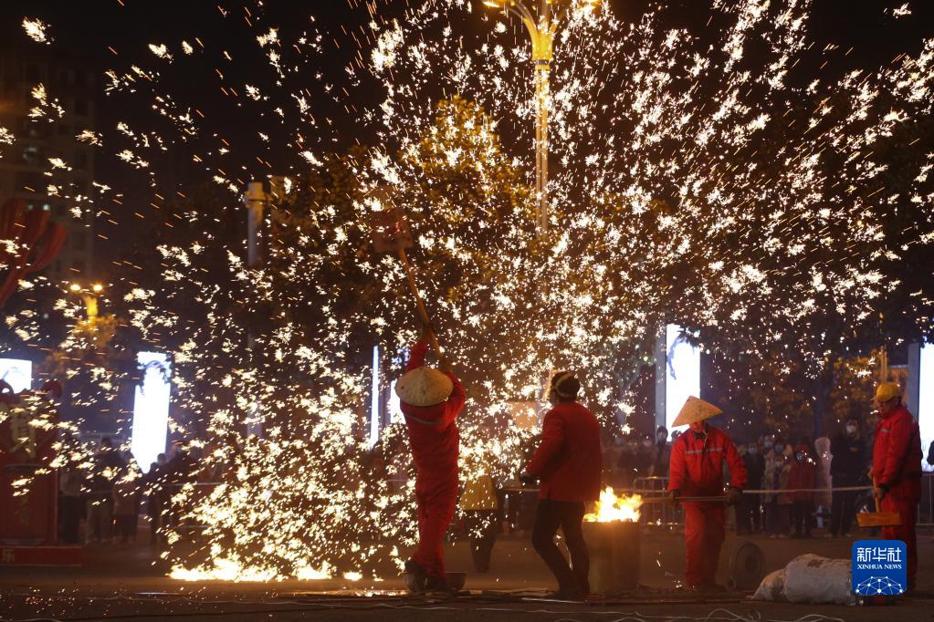 1月18日,民俗藝人在貴州省貴陽(yáng)市云巖區印象城購物中心表演打鐵花。