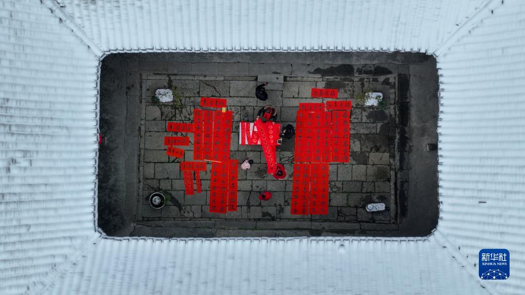 1月18日,在重慶市酉陽(yáng)土家族苗族自治縣桃花源街道龍池村洞子坨傳統村落,當地書(shū)法愛(ài)好者在四合院里為村民書(shū)寫(xiě)春聯(lián)。