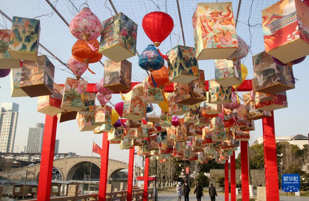 1月18日,在江蘇省蘇州市古胥門(mén)廣場(chǎng),市民在觀(guān)賞迎春彩燈。