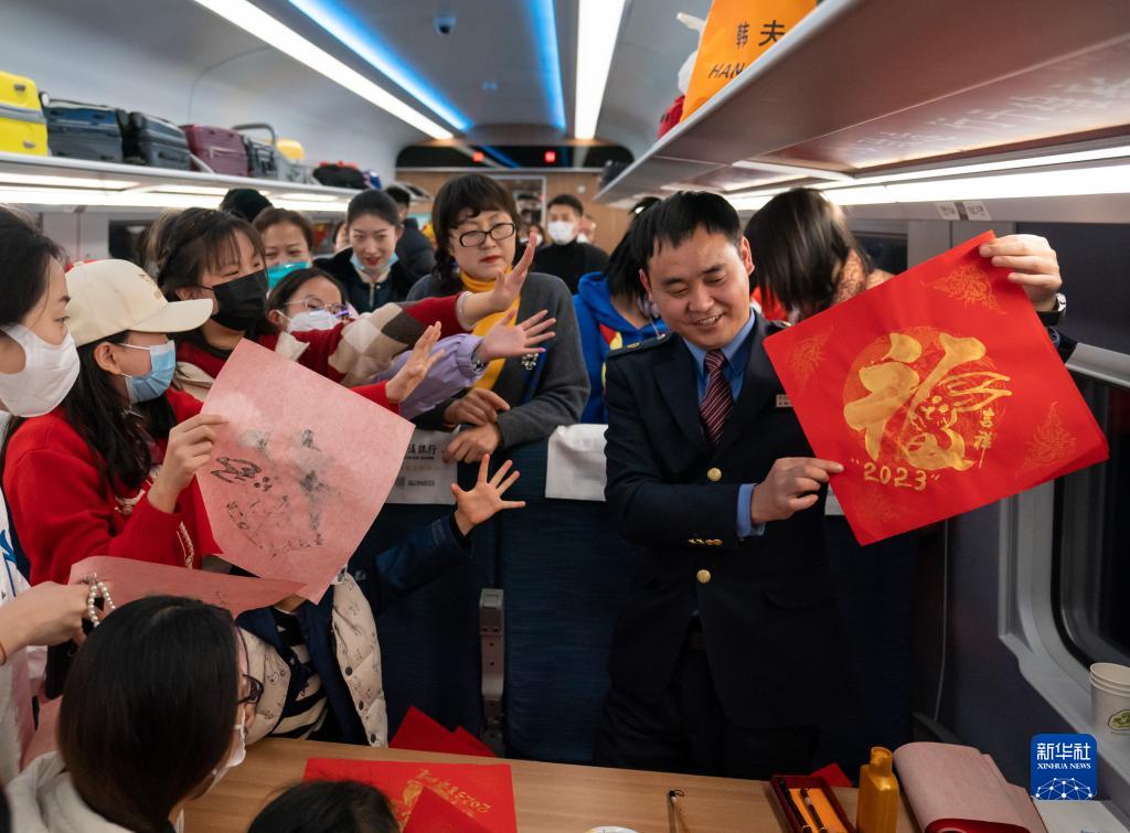 1月19日,書(shū)法愛(ài)好者王獵飛(右一)向旅客贈送福字。