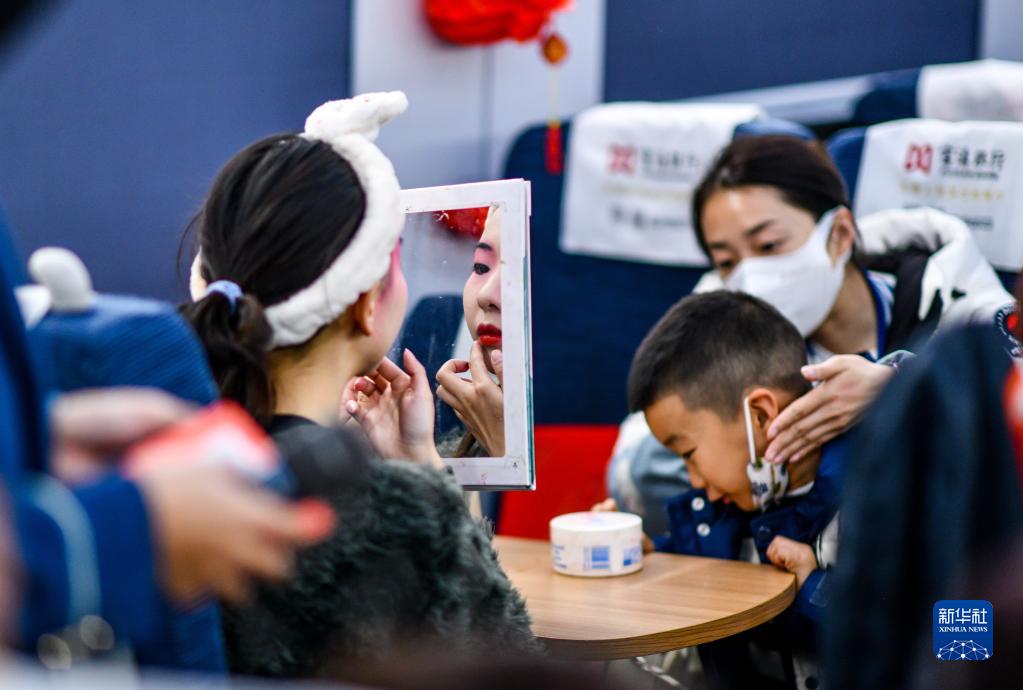 1月19日,演員在列車(chē)車(chē)廂內為演出做準備。
