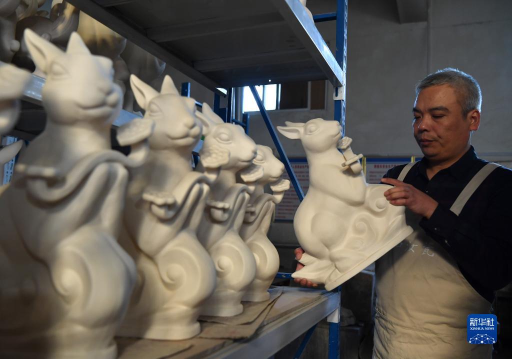 1月18日,在寶豐縣大營(yíng)鎮,汝瓷藝人王占穩在查看汝瓷生肖兔素胎。