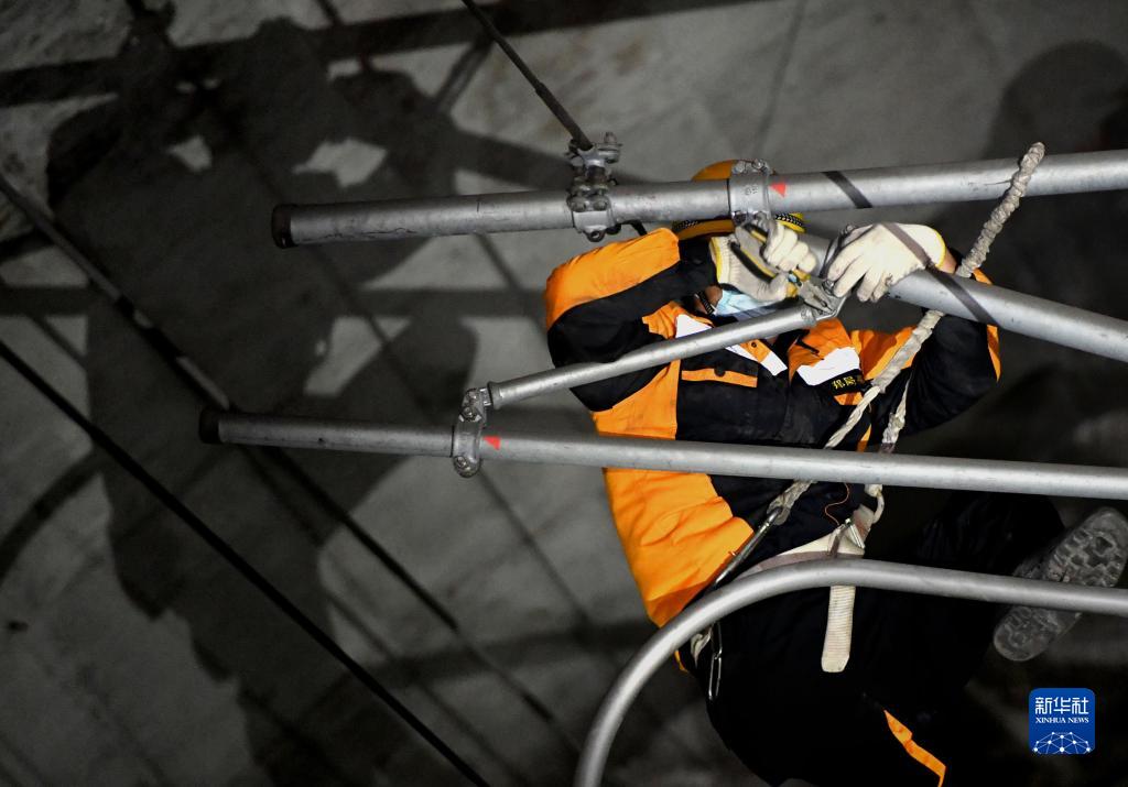 1月19日凌晨,鄭州高鐵基礎設施段作業(yè)人員對新鄭機場(chǎng)站北岔區接觸網(wǎng)支撐裝置進(jìn)行檢修。