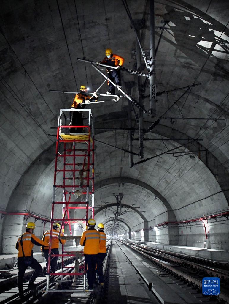 1月19日凌晨,鄭州高鐵基礎設施段作業(yè)人員在新鄭機場(chǎng)站北岔區測量接觸網(wǎng)定位器定位坡度。