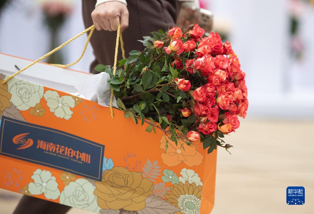 1月18日,顧客提著(zhù)從海南熱帶花卉交易(拍賣(mài))市場(chǎng)選購的鮮花。