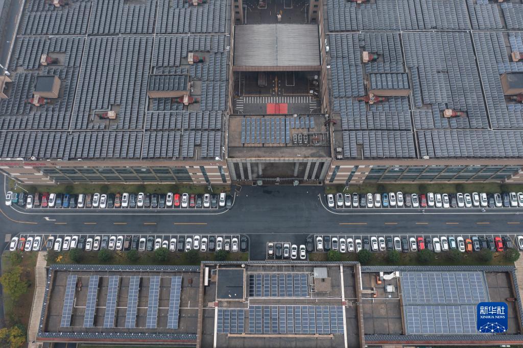 這是浙江省杭州市臨安區金馬工業(yè)園區內的一家“無(wú)廢工廠(chǎng)”,屋頂上安裝了光伏發(fā)電設備(2022年12月9日攝,無(wú)人機照片)。