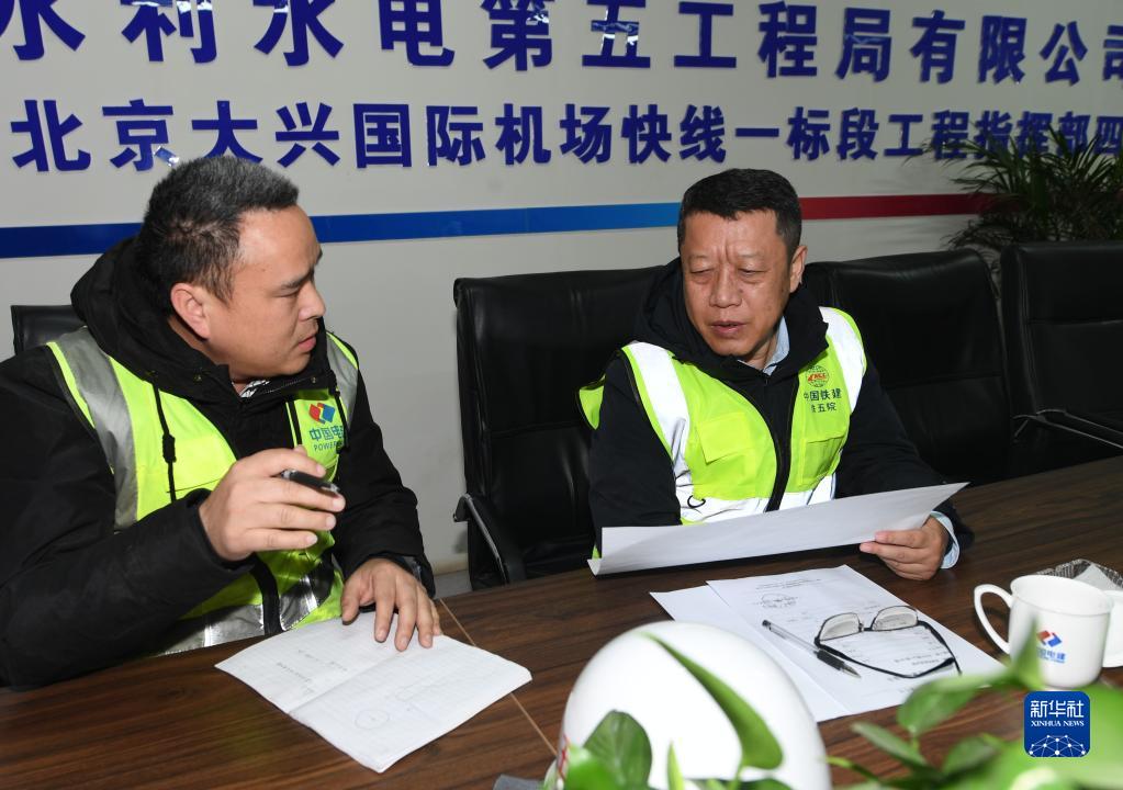 梅東冬(右)在雄安新區至北京大興國際機場(chǎng)快線(xiàn)(R1線(xiàn))一標段項目部工作(1月18日攝)。