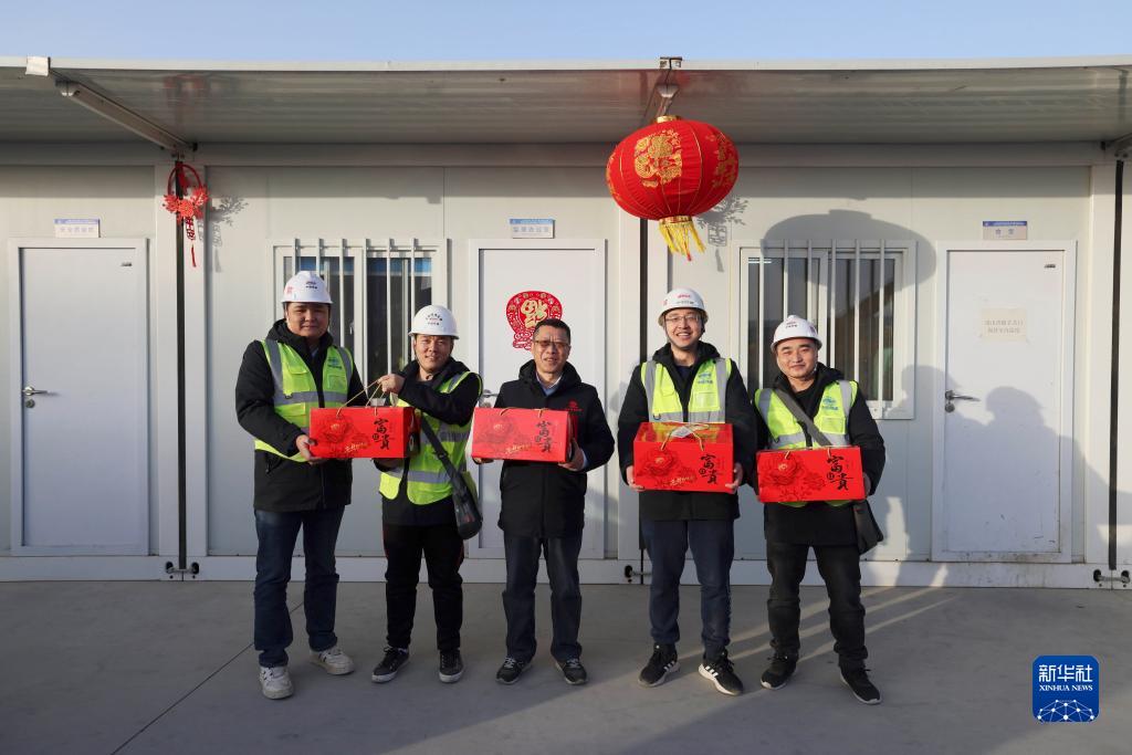 在雄安新區至北京大興國際機場(chǎng)快線(xiàn)(R1線(xiàn))一標段項目部,梅東冬(中)把春節慰問(wèn)品發(fā)放到工人手中(1月18日攝)。