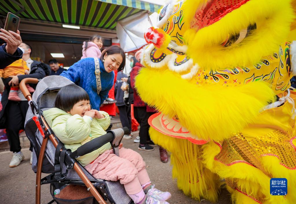 1月19日,在四川省遂寧市蓬溪縣蓬南鎮街頭,舞獅表演者與小朋友互動(dòng)。