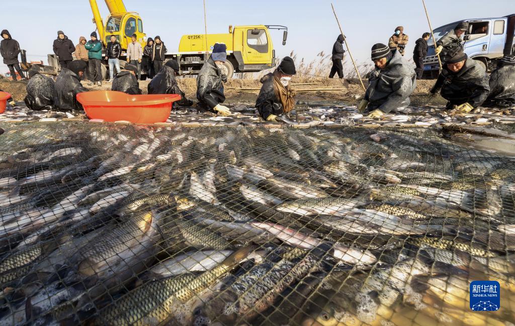 連日來(lái),河北省唐山市豐南區的水產(chǎn)養殖戶(hù)們忙著(zhù)在池塘內破冰捕魚(yú),以供應春節市場(chǎng)。
