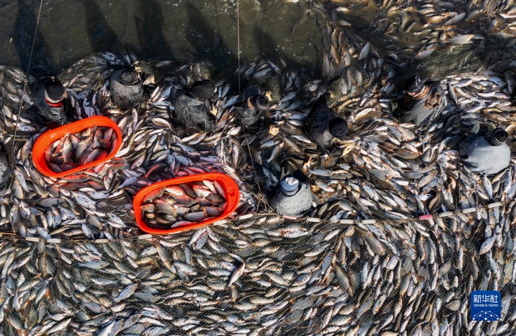 連日來(lái),河北省唐山市豐南區的水產(chǎn)養殖戶(hù)們忙著(zhù)在池塘內破冰捕魚(yú),以供應春節市場(chǎng)。
