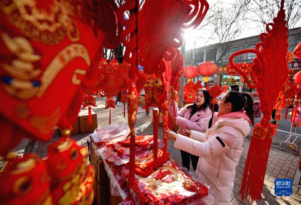 春節將至,在河北省邢臺市南和區的年貨集市,不少市民選購節慶飾品、春聯(lián)、福字等年貨,迎接新春佳節的到來(lái)。