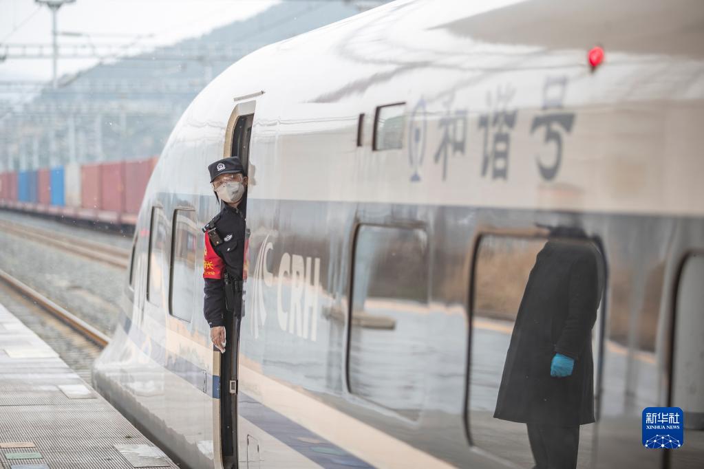 1月16日,在貴陽(yáng)北開(kāi)往西安北的D1703次列車(chē)上,重慶鐵路公安處乘警支隊“芳華”女子乘務(wù)警組的朱小麗在列車(chē)發(fā)車(chē)前瞭望列車(chē)情況。