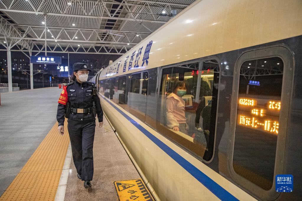 1月18日,在西安北開(kāi)往重慶西的G2233次列車(chē)抵達成都東站時(shí),“芳華”女子乘務(wù)警組的李行對列車(chē)進(jìn)行安全巡視。