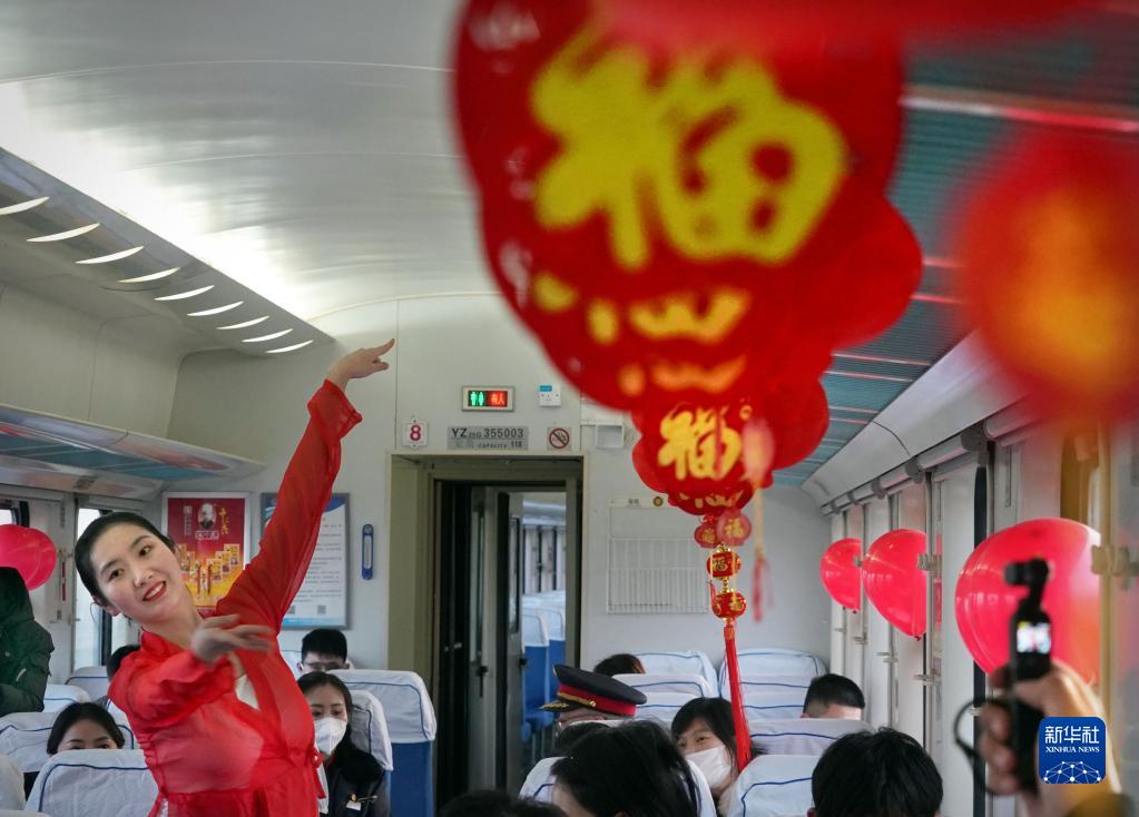 1月20日,工作人員在首趟“紅旗渠”號列車(chē)上表演舞蹈。