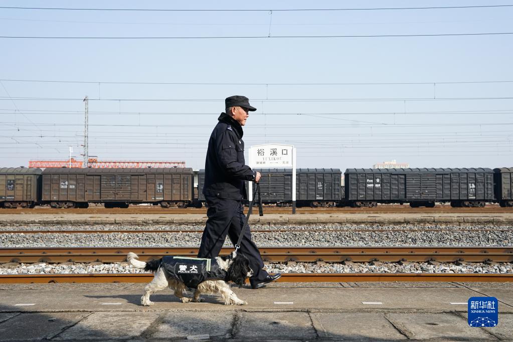 1月18日,民警王支斌和警犬“和平”在車(chē)站內巡邏。