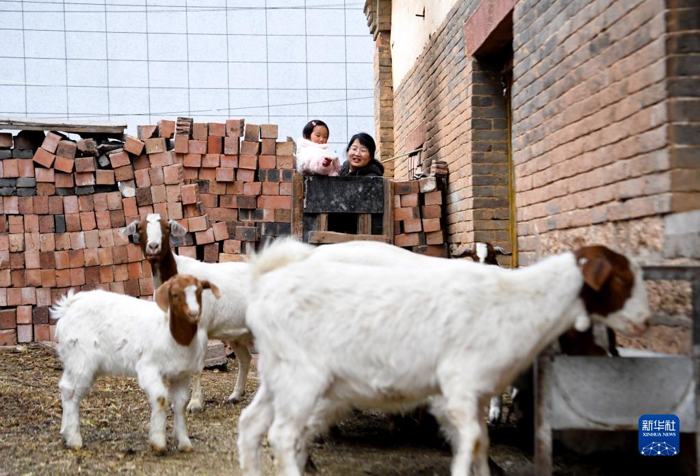 1月19日,呂海云抱著(zhù)女兒靳佳穎數自家羊圈里的羊。