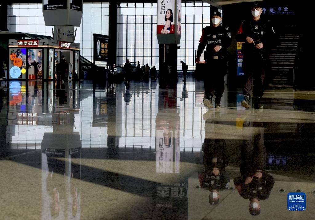 1月21日,合肥鐵路公安處特警支隊特警陳黎(左)和張晨曦在合肥南站內巡邏。
