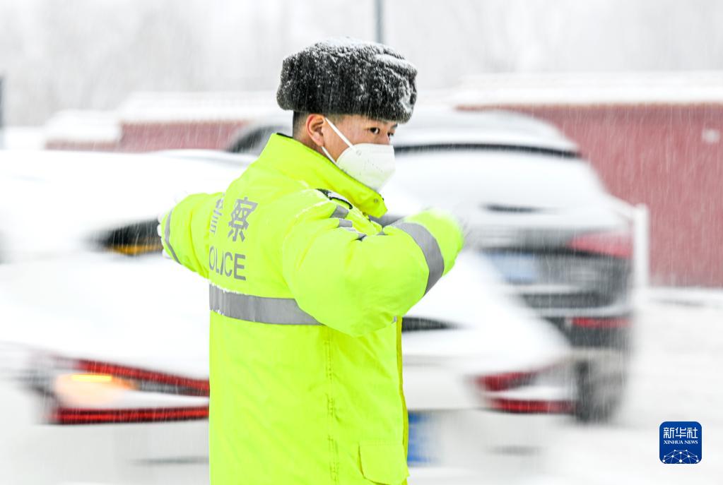 1月21日,在新疆烏魯木齊市西山路騎馬山路口,民警艾曉冬在疏導交通。