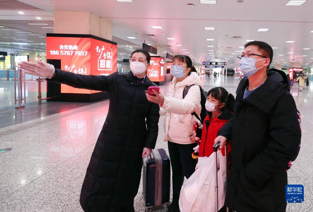 1月21日,申通地鐵集團運一公司員工高煜(左一)在地鐵上海虹橋火車(chē)站站巡視時(shí)為旅客指路。