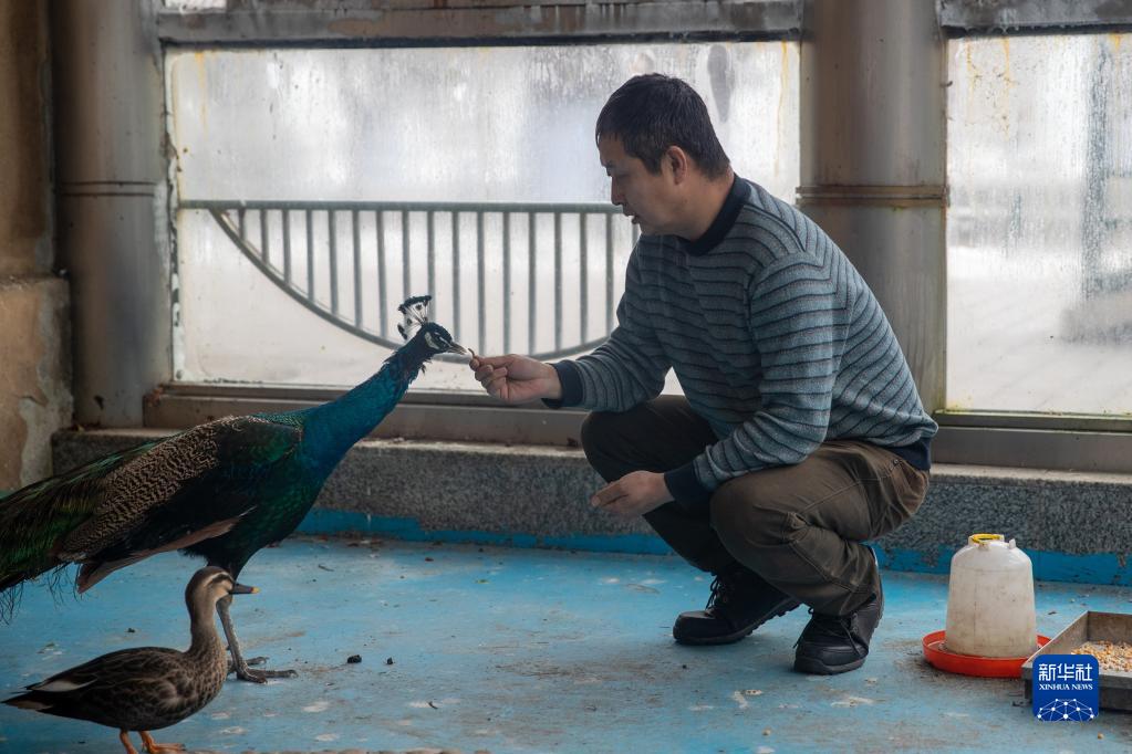 1月21日,在黑龍江省哈爾濱市兆麟公園,工作人員車(chē)春虎在照料孔雀。