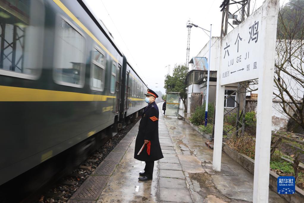 1月21日,在貴州六個(gè)雞火車(chē)站,外勤值班員吳昌輝在站臺接發(fā)旅客列車(chē)。