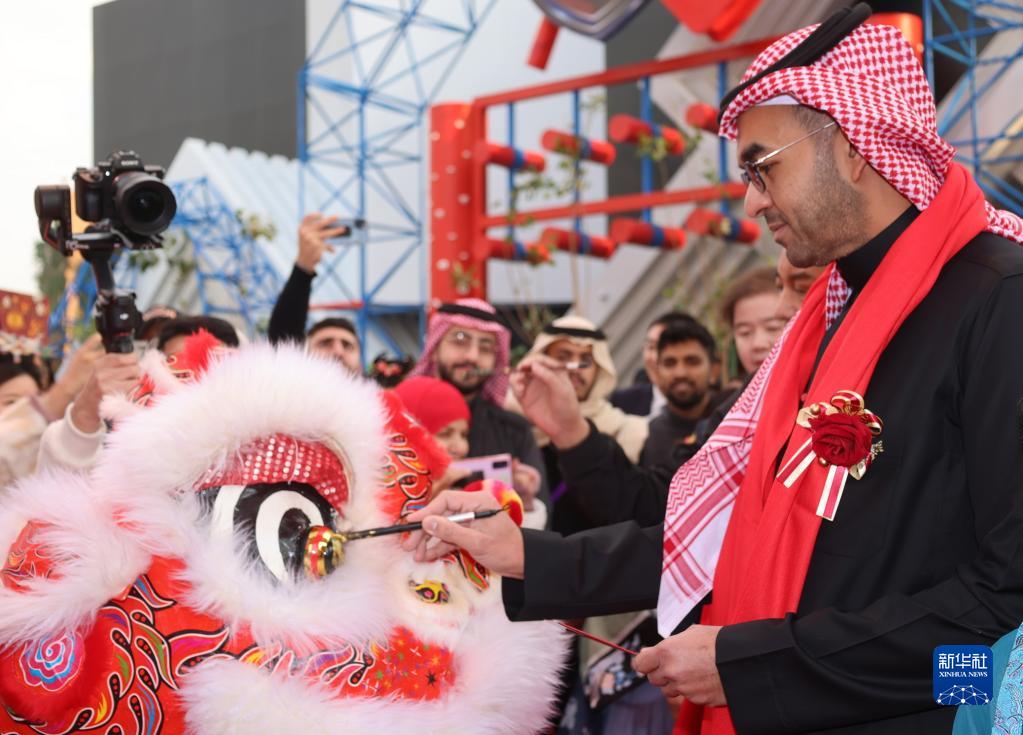 1月14日,在沙特阿拉伯首都利雅得世界大道“中國城”舉辦的“2023歡樂(lè )春節”活動(dòng)中,嘉賓為“醒獅”點(diǎn)睛。